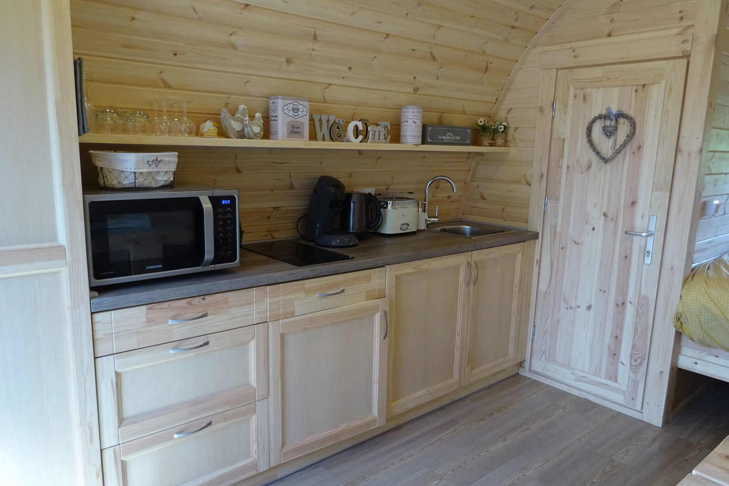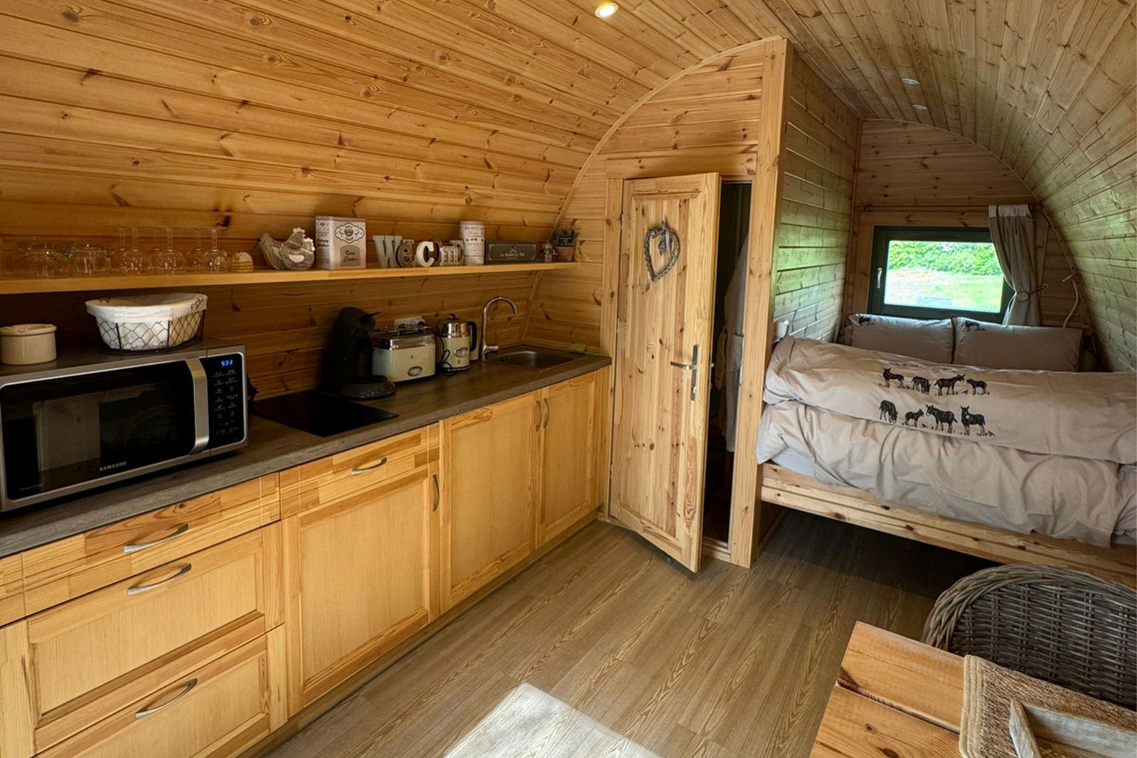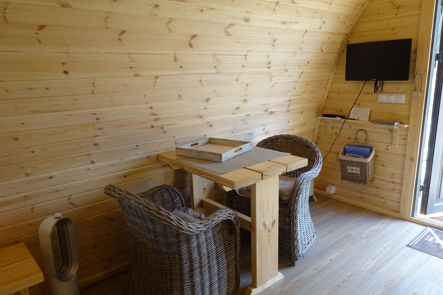 The pod is like a small chalet, a small oval shape bungalow made of wood. lt’s a unusual accommodation, 100% natural!